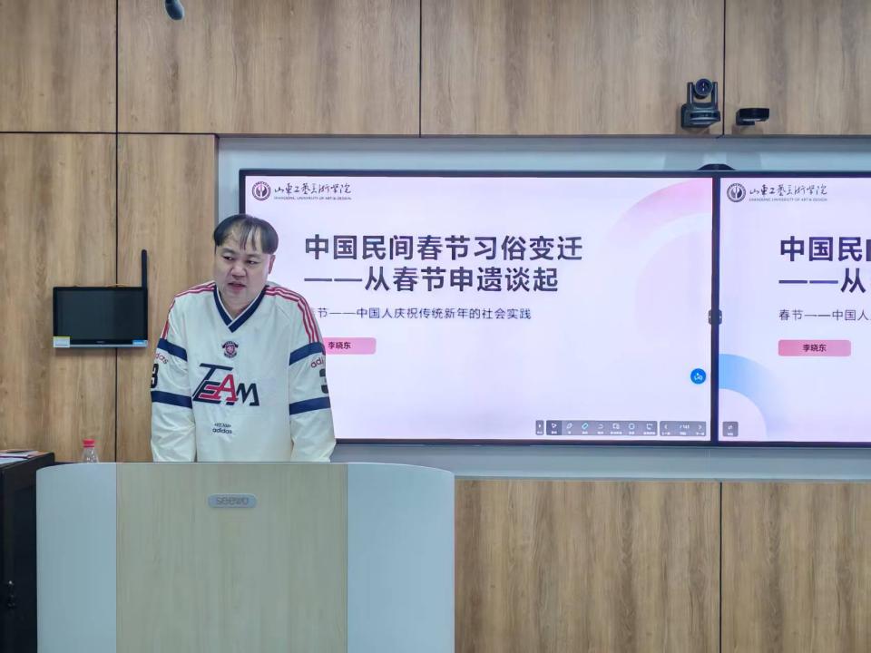 11月17日山东工艺美术学院人文艺术学院在2号教学楼319教室举办《中国民间春节习俗变迁——从春节申遗谈起》专题讲座。本次讲座由人文艺术学院主办承办,学院非物质文化遗产保护专业教师李晓东担任主讲人,全校学生积极参与聆听。