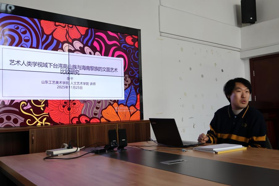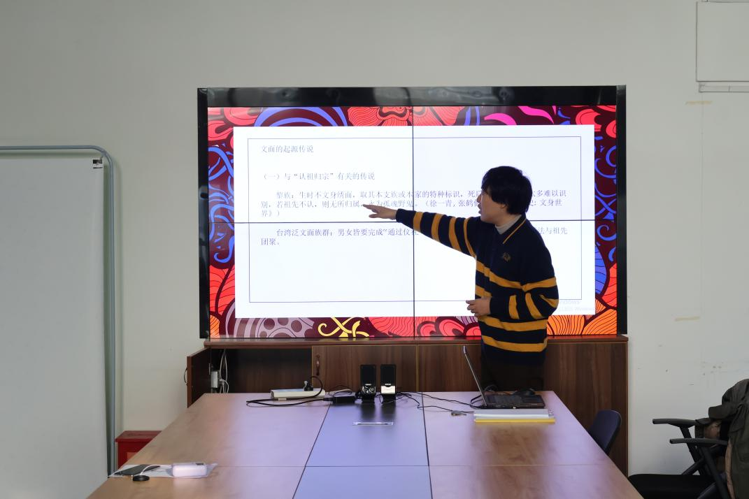 2025年11月25日,在人文艺术学院会议室,人文艺术学院非物质文化遗产教研室讲师李干为全校各专业本科生约50人开展了“艺术人类学视域下中国台湾省高山族与海南黎族的文面艺术比较研究”专题讲座。本次讲座从艺术人类学的视角出发,围绕文面这一古老的身体装饰艺术,结合主讲教师的田野调查经历,重点探讨中国台湾省高山族相关族群及海南黎族文面的纹样、起源传说、社会功能及遗风余韵等内容。