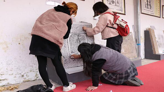 济宁市文物保护中心副研究馆员胡广跃带领大家参观了博物馆,并向大家详细介绍了馆内的画像石藏品。我院2017级艺术品鉴定与修复专业学生在刘允东、邵艳芬两位老师的指导下进行了现场实地教学,并在博物馆技术人员的指导下进行了画像石拓片技能学习。